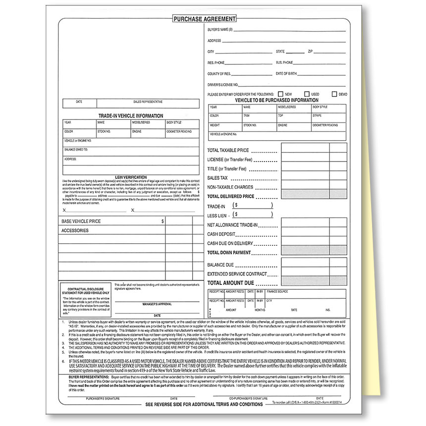 In addition to Trade-In information, Lien Certification, and Vehicle Information, this 2-Part Purchase Agreement includes the Airbag clause required by New York.