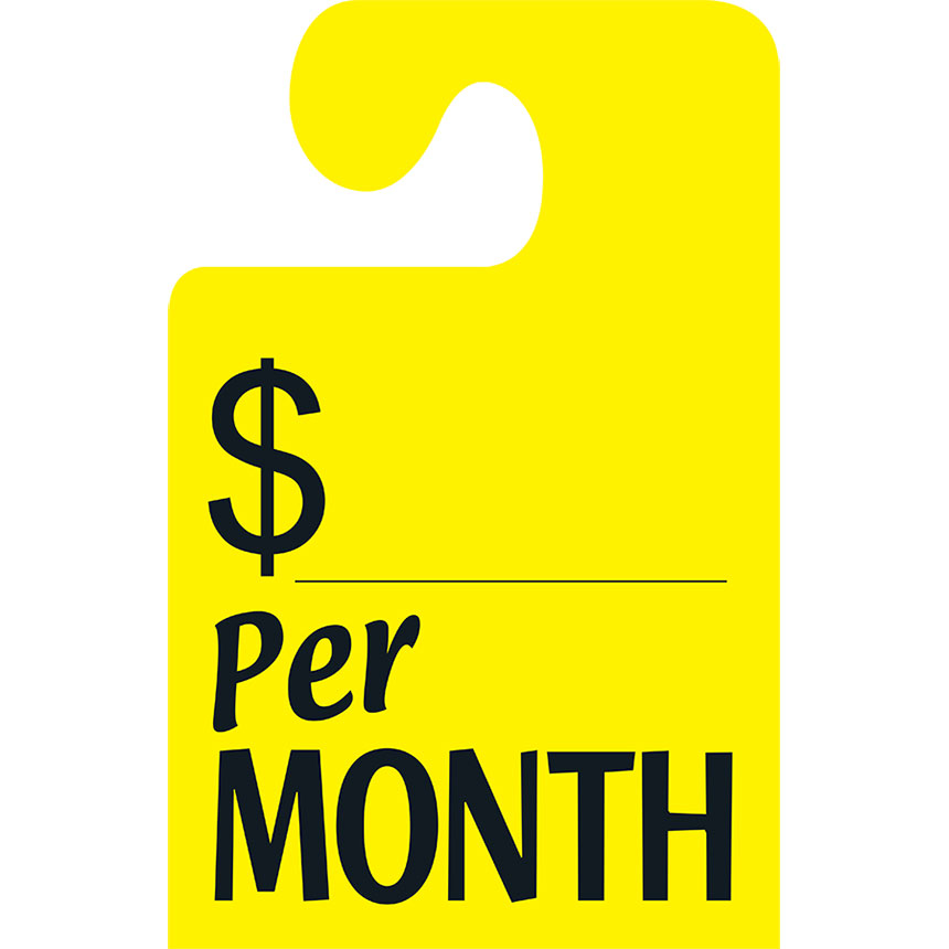 Need a way to advertise a special sale? Our Fluorescent Yellow "Per MONTH" Hook Rear View Mirror Tags will deliver your message and work well with vehicles that have large rear view mirrors. Tags are made of a fluorescent yellow stock paper and can be removed quickly for test drives. Hook Tags are sold in packs of 50 and measure 8.5"W x 11.5"H".