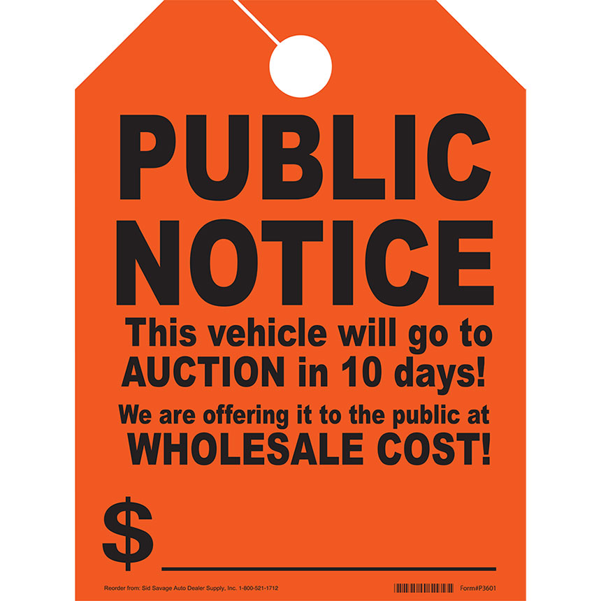 "Public Notice - Auction" Fluorescent Rear View Mirror Tags are made of a fluorescent red stock paper with black print. Mirror tags easily attach to any rear view mirror and can be removed quickly for test drives. Mirror Tags are 8.5"W x 11.5"H and are sold 50 per pack.