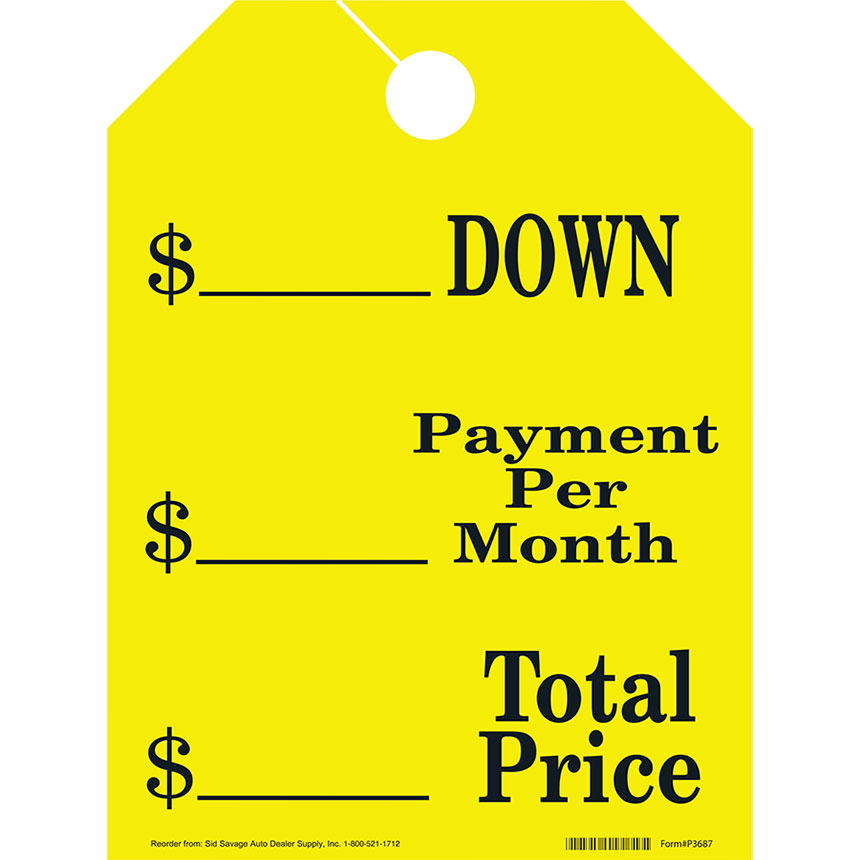 If you want to be heard, then speak up with a batch of these vibrant tags. Yellow "Down/Payment Per Month/Total Price" Fluorescent Rear View Mirror Tags are sold in packs of 50. Mirror Tags are 8.5"W x 11.5"H.